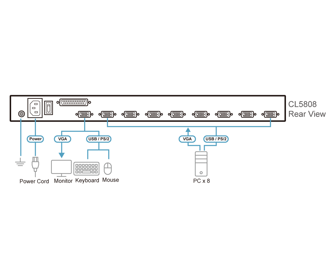 El CL5808 admite tanto teclados y ratones PS/2 como USB para los ordenadores conectados y el CL5808 incluso permite el funcionamiento de periféricos USB con los ordenadores conectados. Una única unidad CL5808 puede controlar hasta 8 ordenadores. Se pueden conectar en margarita hasta 31 switches KVM compatibles, pudiéndose controlar un total de 256 ordenadores desde una sola consola compuesta por teclado, monitor y ratón.
