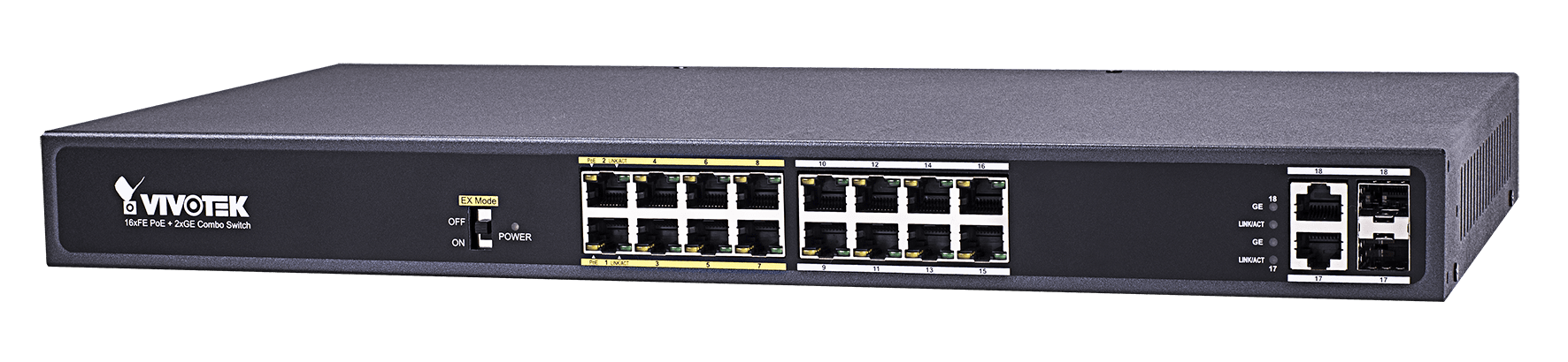 Switch PoE no administrados FE de VIVOTEK equipado con interruptor DIP proporciona modos operativos ST STandard y EX EXtend. Ellos están especialmente diseñados para aplicaciones de vigilancia IP. Además funciones 802.3af / at PoE estándar en modo ST, el modo EX también transmite datos y energía a través de un solo cable de hasta 200 metros de distancia a 10 Mbps a través de puertos EX específicos para cámaras IP PoE de largo alcance.