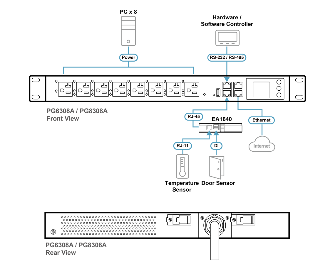 Las PDU de la serie PG están equipadas con puertos de sensor RJ-45 para conectarse con EA1640 que supervisan el estado del entorno del centro de datos, garantizando unas condiciones de funcionamiento óptimas. Ofrecen capacidades de gestión de energía seguras, centralizadas e inteligentes, que permiten a los usuarios encender, apagar o apagar y encender los equipos informáticos del centro de datos, como servidores, sistemas de almacenamiento, conmutadores KVM, dispositivos de red y dispositivos de datos serie.