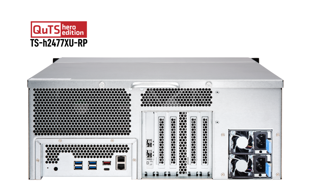 El NAS TS-h2477XU-RP con QuTS hero está equipado con un procesador AMD Ryzen™ 7 que ofrece un increíble rendimiento del sistema y de las máquinas virtuales con hasta 8 núcleos/16 hilos y una potencia de hasta 4,4 GHz. Con el sistema operativo QuTS hero basado en ZFS, TS-h2477XU-RP prioriza la integridad de los datos y es compatible con la deduplicación y compresión de datos en línea a nivel de bloque, instantáneas casi ilimitadas, SnapSync en tiempo real, protocolo SNMP y Servicios de dominio de Azure AD. Al usarse como un servidor de archivos de misión crítica, un servidor de virtualización, un editor de vídeo colaborativo o una eficaz solución de copia de seguridad y recuperación de archivos, el TS-h2477XU-RP ayuda a su empresa a conseguir el increíble rendimiento del acuerdo de nivel de servicio.