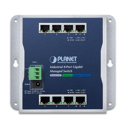 Diseñado para ser instalado en un gabinete de pared o simplemente montado en una pared en cualquier ubicación conveniente, PLANET WGS-4215-8T, un innovador conmutador administrado de montaje en pared industrial de 8 puertos 10/100/1000T, ofrece administración de pila dual IPv6/IPv4, función de administración inteligente de capa 2 e interfaz fácil de usar. El WGS-4215-8T es capaz de funcionar de forma fiable, estable y silenciosa en cualquier entorno sin afectar a su rendimiento. Con una velocidad de red ultra rápida y una temperatura de funcionamiento que oscila entre -40 y 75 grados C en una carcasa metálica IP30 compacta pero resistente, el WGS-4215-8T es una solución ideal para satisfacer la demanda de las siguientes aplicaciones de red: