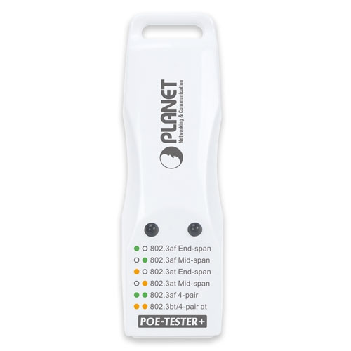 PLANET POE-TESTER+ es un adaptador de diagnóstico PoE de nueva generación y fácil de usar para instaladores de red, integradores de sistemas, MIS de empresas e incluso usuarios domésticos para identificar rápidamente la existencia de Power over Ethernet en la red de aplicaciones. Está diseñado para detectar si el voltaje PoE IEEE 802.3af/at/bt pasa por el cable UTP e identificar el tipo de PSE (equipo de fuente de alimentación) para solucionar problemas.